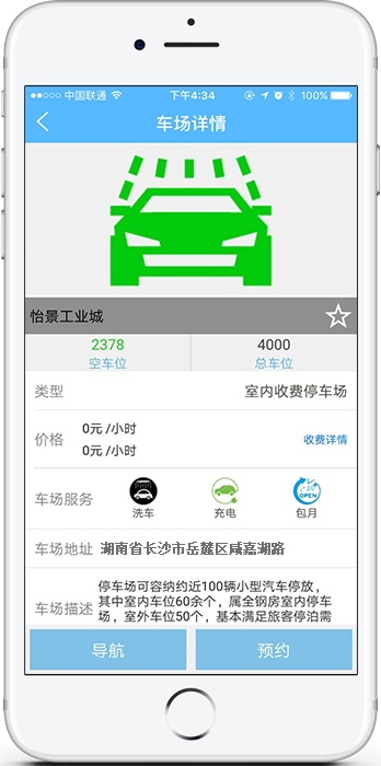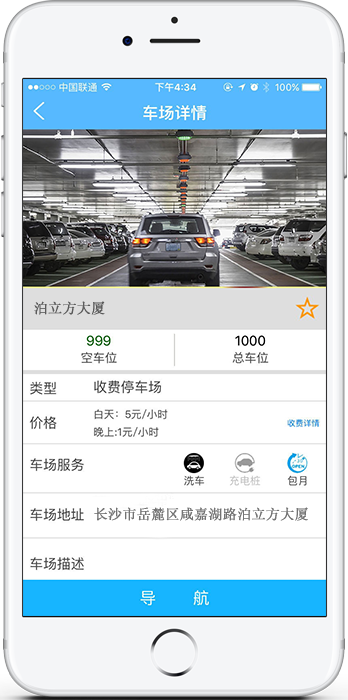 点击地图上的停车场气泡,展示停车场详情信息,距离、位置、服务、价格一览无遗,空余车位数实时更新。