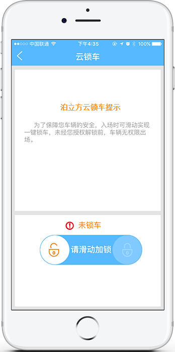 一键滑动,给爱车加把锁,未经授权解锁,车辆无权限出场,排除被盗隐患。