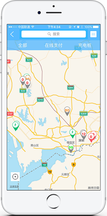 点击地图上的充电桩气泡,展示充电桩详情信息,查看位置,预约、导航,空余充电位实时更新。