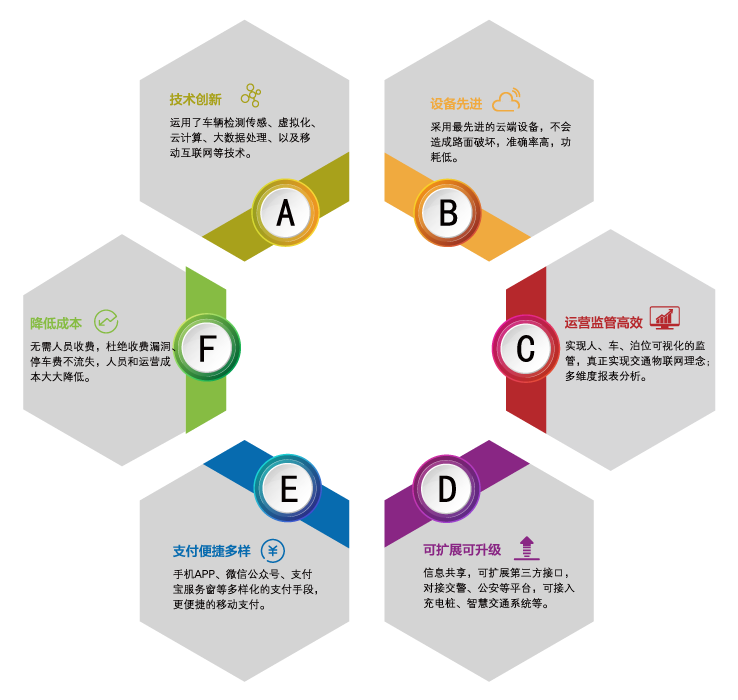 泊立方城市级路边停车系统,对城市停车运维管理和车主服务推出的整体信息化集成解决方案,实现了停车位数据采集、状态监控、停车位查找、在线注册、充值及缴费、执法监管等项创新功能。它综合利用了车辆检测传感技术、无线通信技术、虚拟化技术,并基于云计算、大数据处理、移动联网等新兴的前沿技术,起到了对城市资源的高效管理,对停车行为的实时监控,对运维团队的有力支撑,并最终实现为各类车主提供全面的交通信息服务。